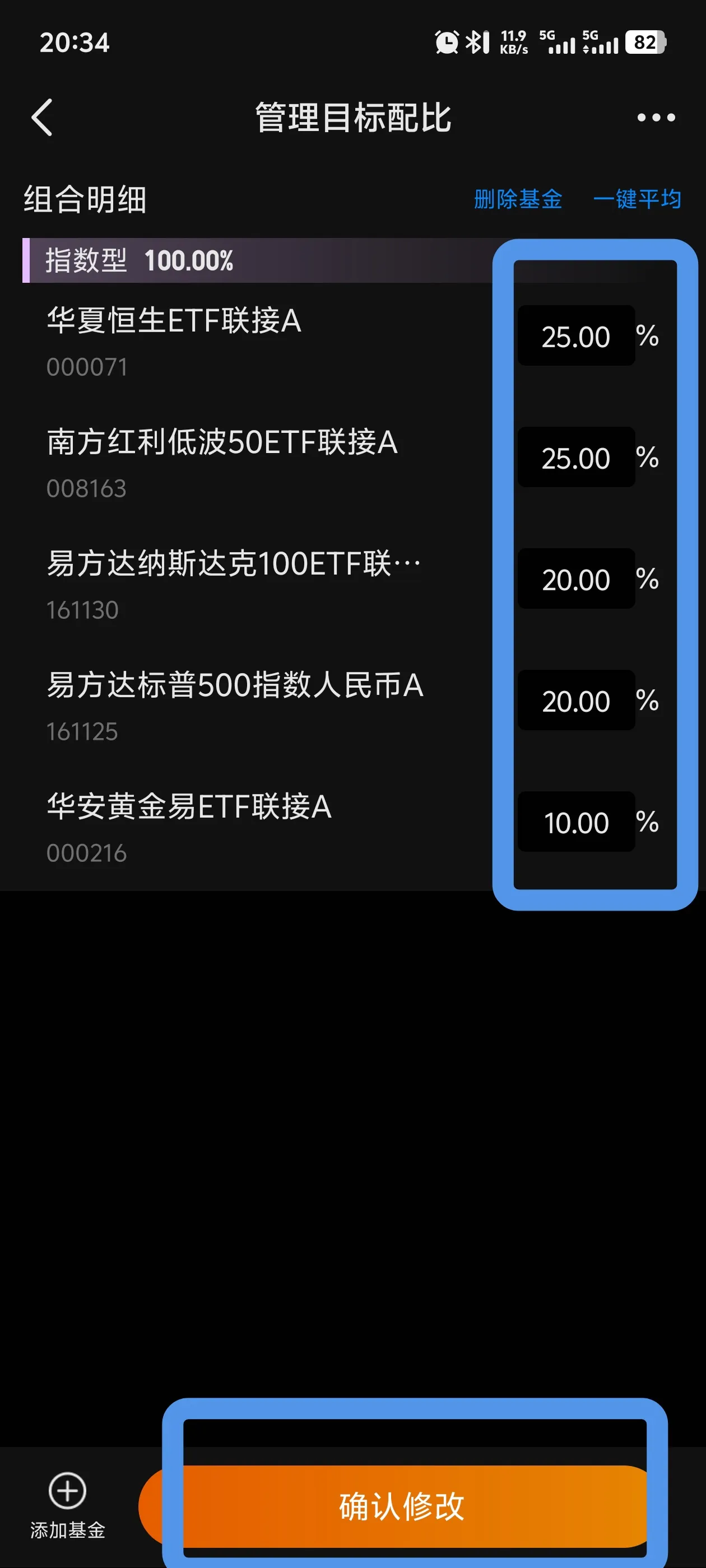 基金添加完毕后,在右侧输入对应基金的配置比例。输入完成后,点击下方“确认修改”。