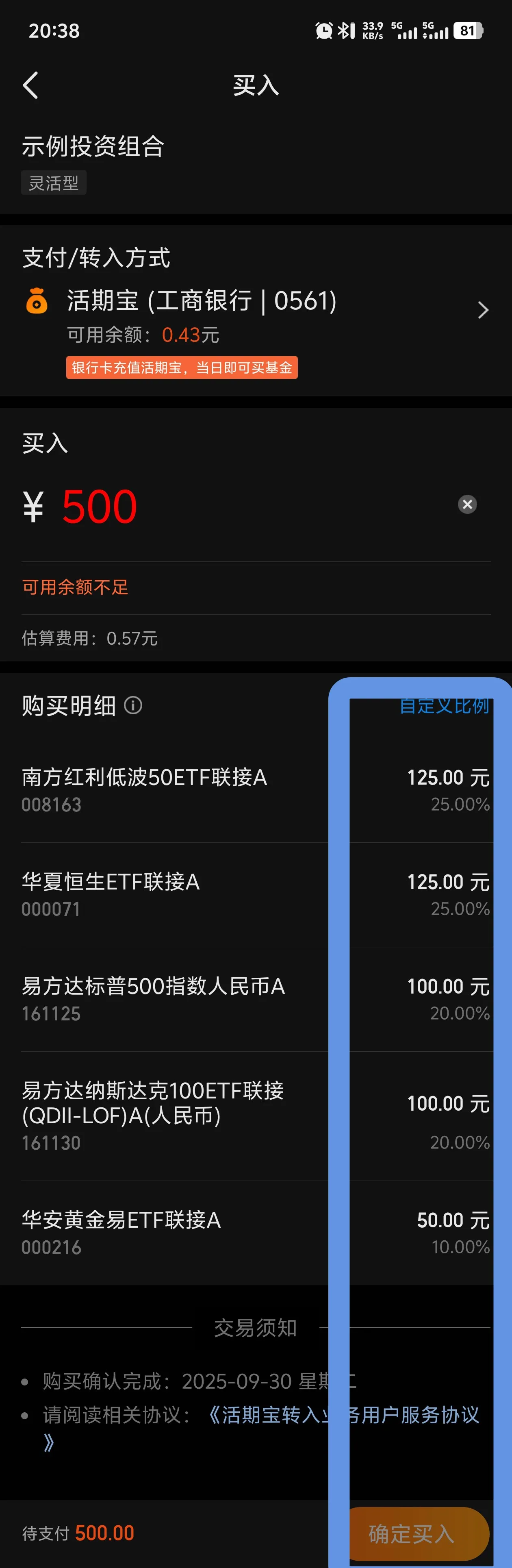 在“目标配比”界面,点击下方“买入”。然后输入金额,检查分配比例,然后点击下方“确认买入”即可。(注意:美股指数基金通常会受QDII额度限制,从而发生限购。这时可以选择减少加仓金额,或按照系统提示将超出部分资金留作今后再平衡。)